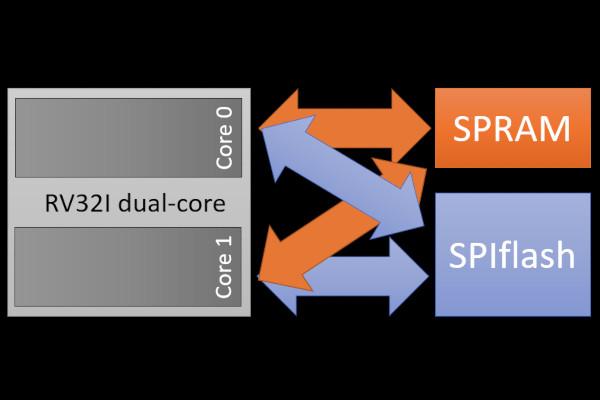 "Two RISC-V cores, two memory interfaces, executing in parallel from shared SPRAM and SPI flash ~ 2K LUTs," Sylvain writes alongside a short video demonstration. "Coming soon in Silice! Both cores can access both memories. While one core waits on SPI flash, the other is free to execute on SPRAM."