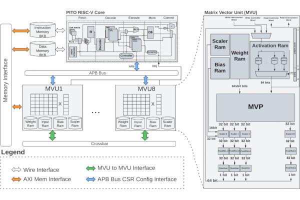This is where BARVINN comes in. Built around eight processing elements with a RISC-V controller core, and designed using FuseSoC, BARVINN is capable of operating at arbitrary precision - including sub-8-bit. "BARVINN performs GEMM/GEMV, Convolutions, Maxpooling, and Activation (ReLU)," its creators explain.
