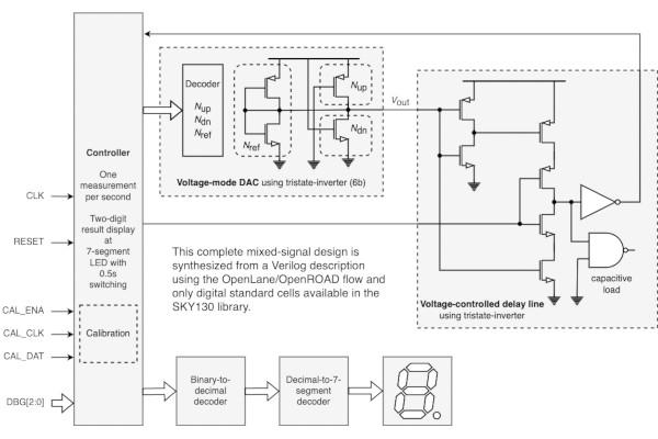 "By creatively twisting the use of a tristate-inverter (EINVP) a voltage DAC Digital to Analogue Converter is built. This voltage-mode DAC is used in another twisted arrangement of an EINVP to bias an NMOS into sub-threshold operation to discharge a pre-charged capacitor (the input capacitor of an inverter)," Harald explains.