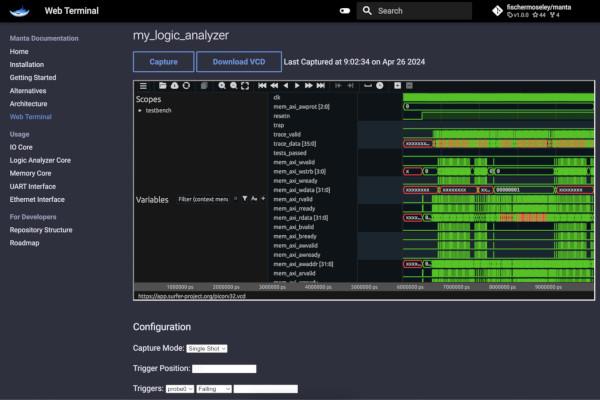 Fischer highlights two key features of Manta as being the most exciting: the ability to capture logic analyser data as a waveform file or as a Verilog module, the latter of which can be loaded into a simulation testbench to generate an exact duplicate of the original waveform; and an upcoming web terminal function, which uses the Web Serial API to run Manta in-browser. "Everything here is run locally in your browser," Fischer says, "no installation required! Nothing is sent to an external server either."
