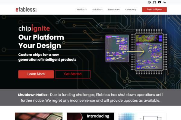 “Due to funding challenges,” a notice on the Efabless website reads, “Efabless has shut down operations until further notice. We regret any inconvenience and will provide updates as available.”