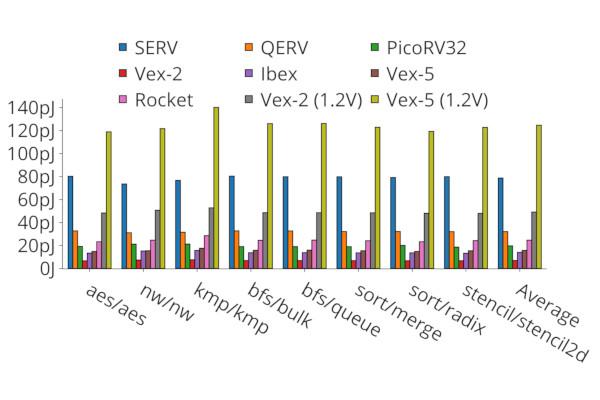 "We find that SERV, QERV, PicoRV32, and Vex are Pareto-optimal in one or more of performance, power, and area. The 2-stage Vex (Vex-2) is the most energy efficient core overall, mainly because it uses fewer cycles per instruction than multi-cycle SERV, QERV, and PicoRV32 while retaining similar power consumption. Pipelining increases core area, and we observe that for sub-threshold operation, the longer wires of pipelined designs require adding buffers to maintain a cycle time that is low enough to achieve high energy efficiency. These buffers limit the performance gains achievable by deeper pipelining because they result in cycle time no longer scaling proportionally with pipeline stages.